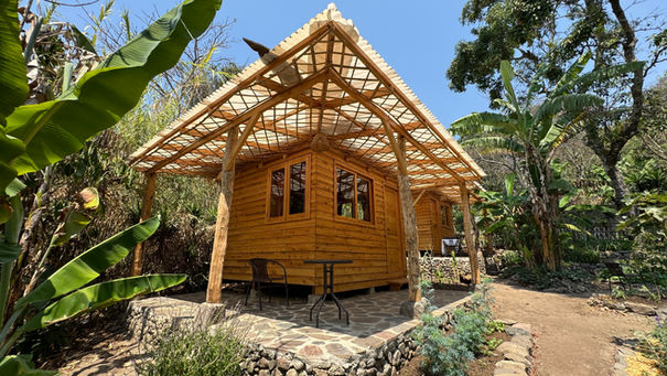 These cozy, bright, spacious wood cabins are perfectly situated for those who'd like their own space, with private entrance, garden view, and patio to relax. With electricity & secure doors/windows.1 queen bed & desk per cabaña. 30-second walk to shared toilet and shower facilities.